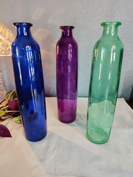 9 1/2" Tall Vintage Colored Vases Cylindrical Cobalt Blue Seafoam Green Amethyst Purple Set