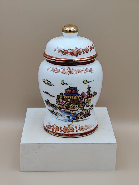 Vintage Medium Ginger Jar Porcelain Japan White Gold Japanese Village 5.5"